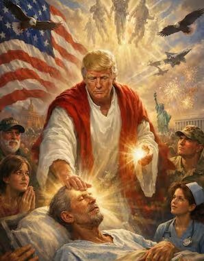 Puede que esta sea una imagen que represente la sanación, pero está claro que Trump no es médico. Más bien, está dando lo que se conoce como el toque taumatúrgico, el poder milagroso de sanar mediante la imposición de manos. Si el creador de la imagen hubiera omitido la túnica blanca y el manto rojo, podría haber afirmado que simplemente representaba el «toque real», el poder de curar que atribuían a los reyes, especialmente a los reyes ingleses y franceses, en la Edad Media. Pero esa afirmación también roza la blasfemia, dado que el poder de curar supuestamente provenía (y reforzaba) el derecho divino del rey a gobernar.