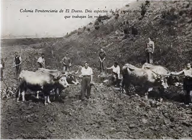 Porque además de soportar el trabajo y el peligro que muchas de las obras imponían a los reos, recibían de continuo la propaganda del régimen pasando por un adoctrinamiento continuo. Se les obligaba a levantar el brazo con el saludo romano, a cantar canciones falangistas, gritar Vivas a Franco, a la Falange y a España, además de concienzudas lecciones del catolicismo rampante que existía en el momento. Cualquier rebeldía era castigada con el fusilamiento o el ahorcamiento inmediato, o un traslado a otro lugar más peligroso, más agotador. Hay testigos que contaban como al final de la jornada laboral, llegando extenuados a los barracones después de doce o catorce horas de trabajo, se les hacía formar, cantar y dar los consabidos gritos de España, Franco y José Antonio. Hubo casos de que en la fila de presos alguno caía al suelo desmayado, prohibiendo atenderle hasta el final de las arengas. Algunos caían muertos. Un testigo, interno del Dueso, confesaba que hubo veces que llegaron a catorce los muertos de agotamiento en un mismo día. Los fallecidos eran recogidos en un carro tirado por mulas con destino desconocido.