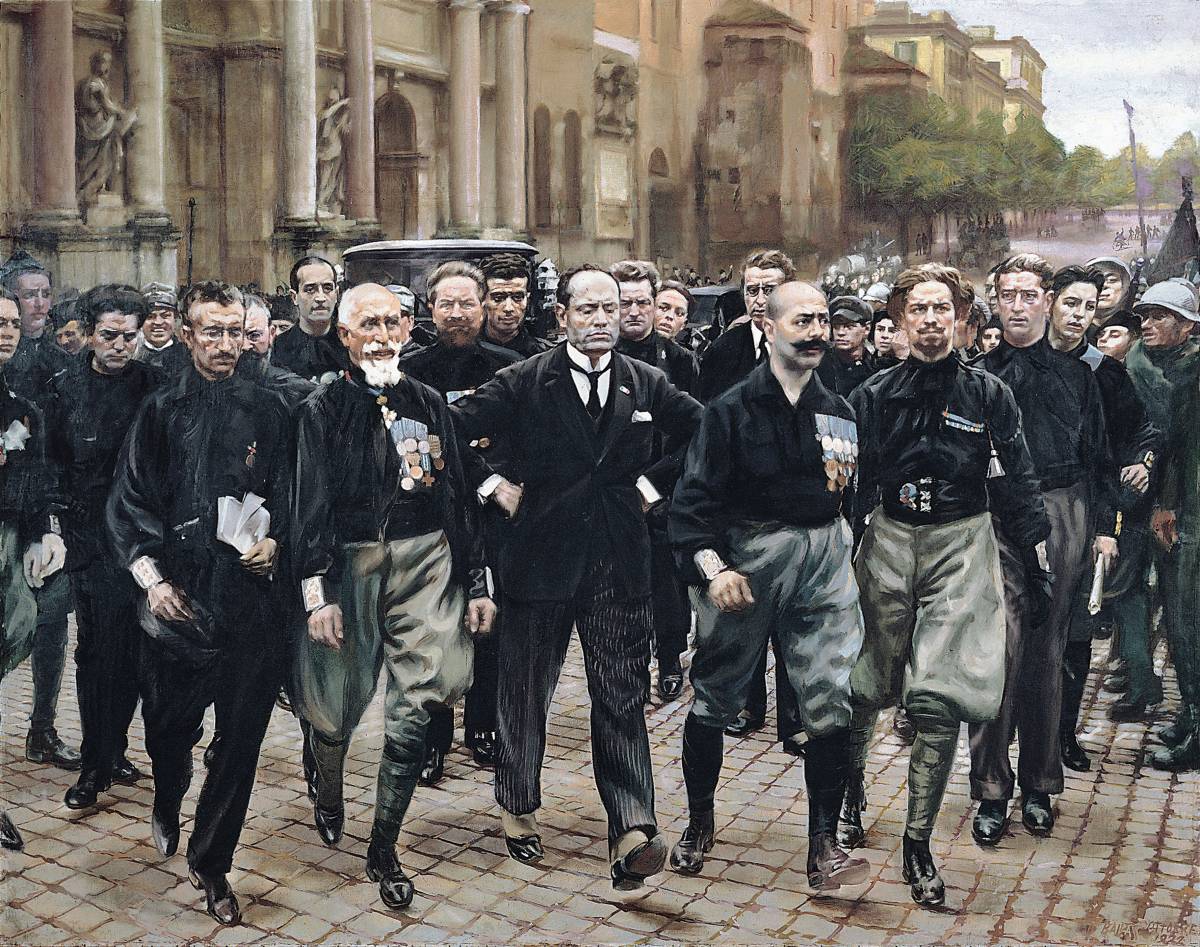 En Octubre de 1922 se produce la Marcha sobre Roma. Aunque a menudo se presenta como un acto de fuerza, fue en gran medida una demostración de poder político. Poder político falso como moneda de madera ya que ni eran tantos ni tenían nada para combatir.