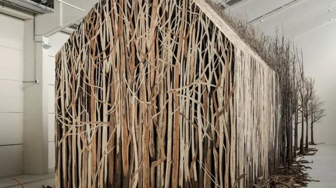 Los 804 árboles muertos que configuran la obra apelan a nuestra naturaleza más primigenia, a nuestro origen. Un buen puñado de ellos se entrelazan para configurar la estructura más llamativa de la instalación: una gran casa que se desvanece poco a poco, en metros y metros de más árboles sin vida. Y en ese desvanecimiento, todo lo que los inmigrantes dejan atrás en su huida: el hogar, la familia, los anhelos, la tierra propia. Un camino sin retorno. Un camino hacia la nada.