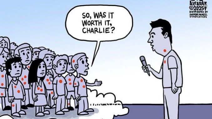 Kirk tenía un tono bronco de los que hacen que los perros se sienten y bajen las orejas. Si te gusta ese estilo de primer curso de fascismo aplicado a la retórica, te hace suyo enseguida. Hay quien se pone palote cuando alguien con esta energía autoritaria, envolvente, entra en la sala. Kirk se sentaba y era otro truco. No se ponía al nivel de sus oponentes al renunciar a estar de pie frente a ellos. Sabía bien que no le hacía falta porque contaba con recursos para encandilar a muchos desde las tripas, como la vehemencia necesaria y unos cuantos conceptos simplificados hasta el absurdo. A otros era capaz de acorralarlos con la ametralladora de preguntas que no pueden responderse con brevedad, en un formato de partido de tenis. Imagino que se daban cuenta de que habían caído en la trampa demasiado tarde. Kirk, para entonces, ya estaba relamiéndose.