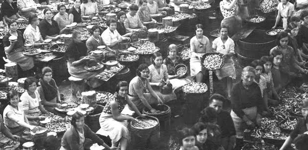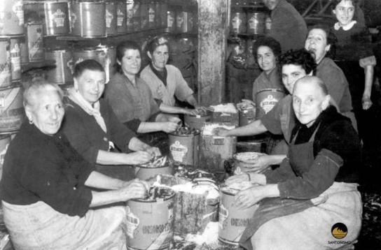 Mientras, en el pueblo, se va formando la precaria industria de la anchoa. Las “sobadoras”** como dijimos al principio son todas mujeres, Emilia con diez años entra a trabajar en una de las empresas que comienzan a nacer. La tienen que poner un banco para que llegue a la mesa y aprende a “sobar” las anchoas. La furia de la desesperación fue quizá lo que le espoleo a ser la mejor, la más rápida, la que pulía la carne del preciado tesoro con más destreza no dejando ni una sola espina, ni una resma de lo desechable. Como ella, las mujeres y las jóvenes, niñas casi de Santoña empiezan a llenar las naves que se van formando al calor de la inversión industrial que convierte en unos años al pueblo en un imperio industrial con la anchoa como protagonista.
